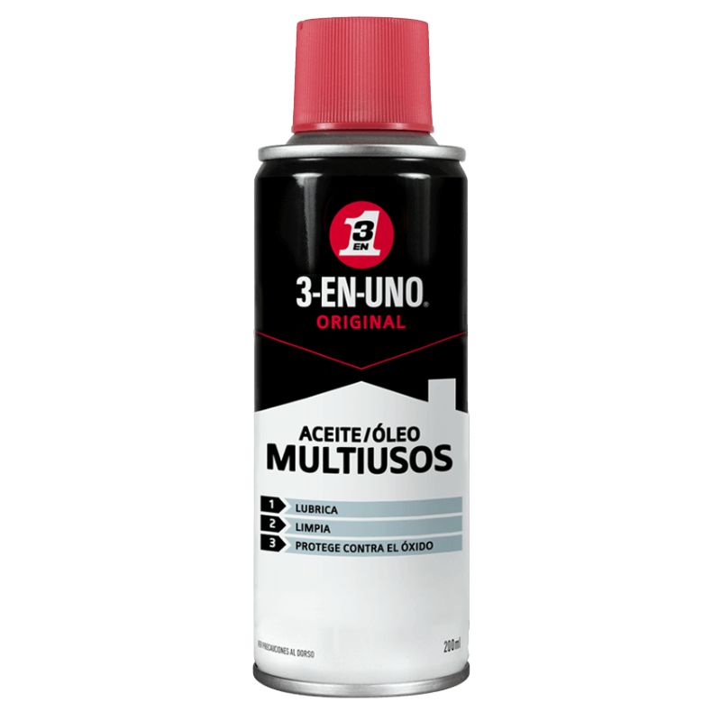 3-EN-UNO ORIGINAL Aerosol es el famoso y auténtico aceite multiusos que sirve para todo. Su fórmula a base de aceite mineral lubrica eficazmente los mecanismos, elimina los chirridos, limpia el metal y protege contra el óxido y la corrosión.