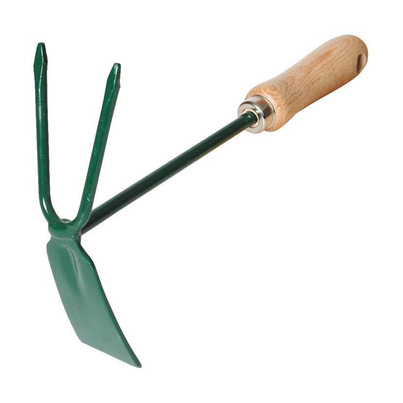 Acero pintado epoxi. Mango madera barnizada fijado con virola metálica.