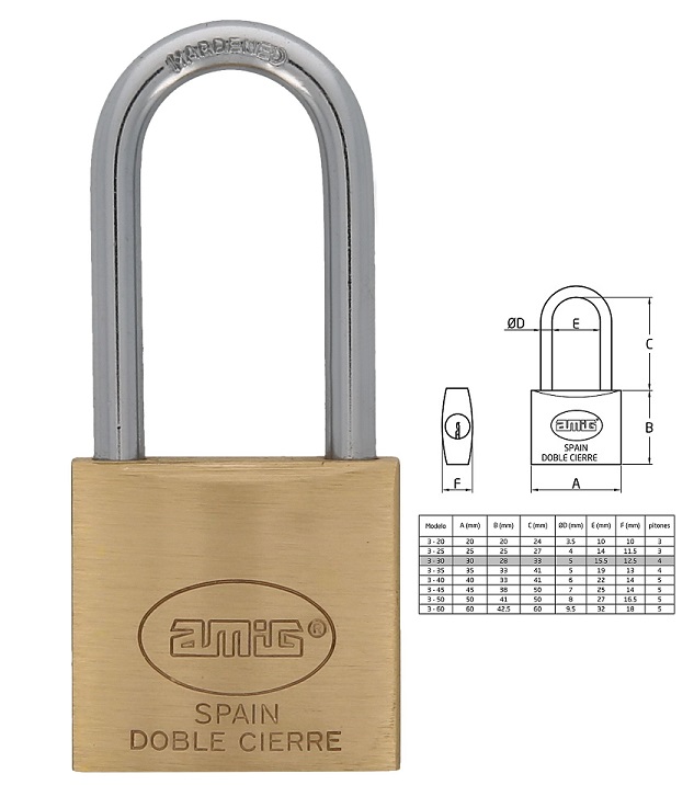 CANDADO 30-40 LATON ARCO LARGO LLAVES IGUALES