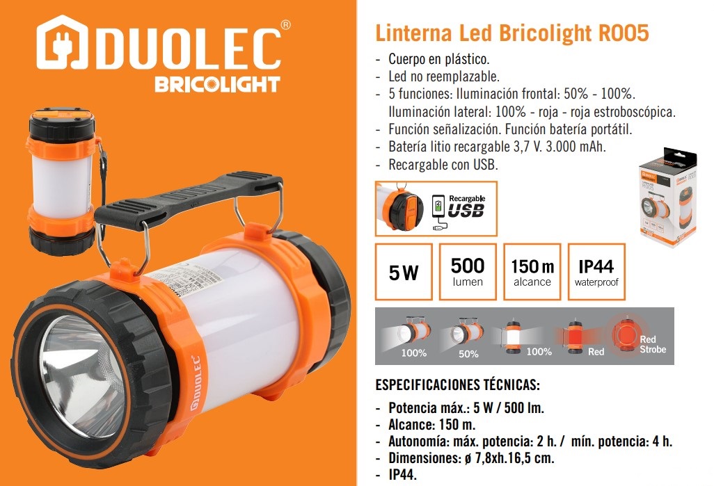 Batería litio recargable 3.7 V 3.000 mAh. Recargable USB. Función de señalización. IP44. Función de batería portatil. LED no recambiable.Potencia máx: 5 W. / 500 lm. Alcance: 150 m. Autonomía: máx. 2 h / mín. 4 h. Dimensiones: ø 7,8×16,5 cm.