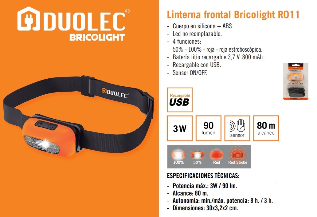 Batería litio 3,7 V 800 mAh. Recargable USB. Función de señalización. LED no reemplazable. Expositor display 8 unidades. Potencia máx: 3 W. / 90 lm.