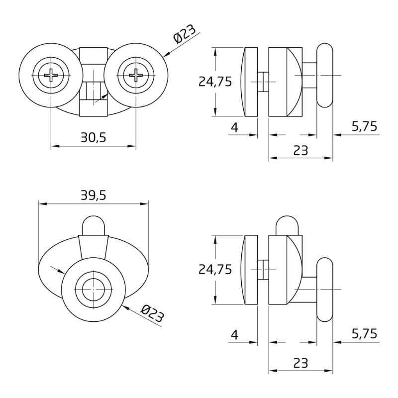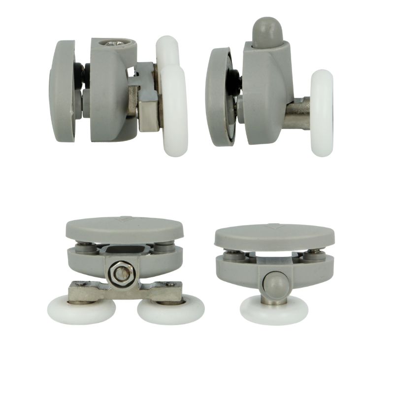 Juego de rodamientos de pinzas (superior e inferior) con rueda de Ø23 mm para mamparas de cristal. Para cristales de mampara de espesor de 4 a 6 mm.