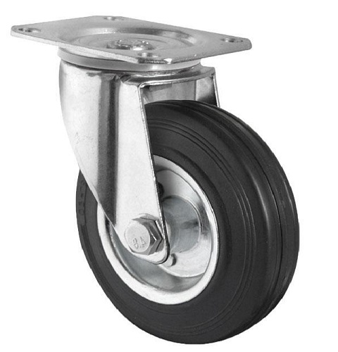 Ruedas de goma con metal y placa especiales para carretillas industriales, contenedores, cajas de herramientas, etc. Para pesos de hasta 150 kg. Fabricadas en goma de color negro y acero cincado. Ruedas adecuadas para uso industrial y doméstico. Están hechas de goma dura y no arañan ni dañan el suelo, por lo que pueden usarse en suelos delicados sin causar ningún daño. Medida Placa 105 x 80 mm Medida Taladro/placa 9 m, Alto Total 125 mm, Med. Ancho 128 mm, Eje Cojinete liso, Peso Max. 100 kg
